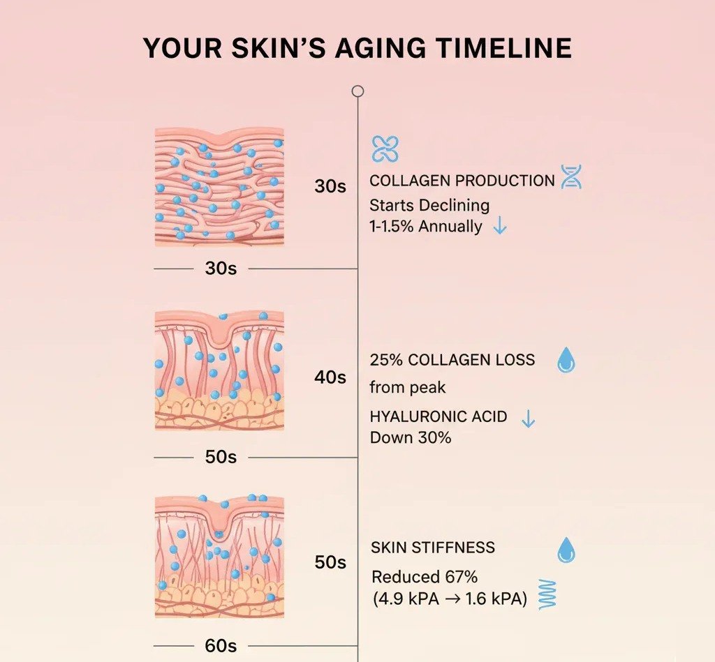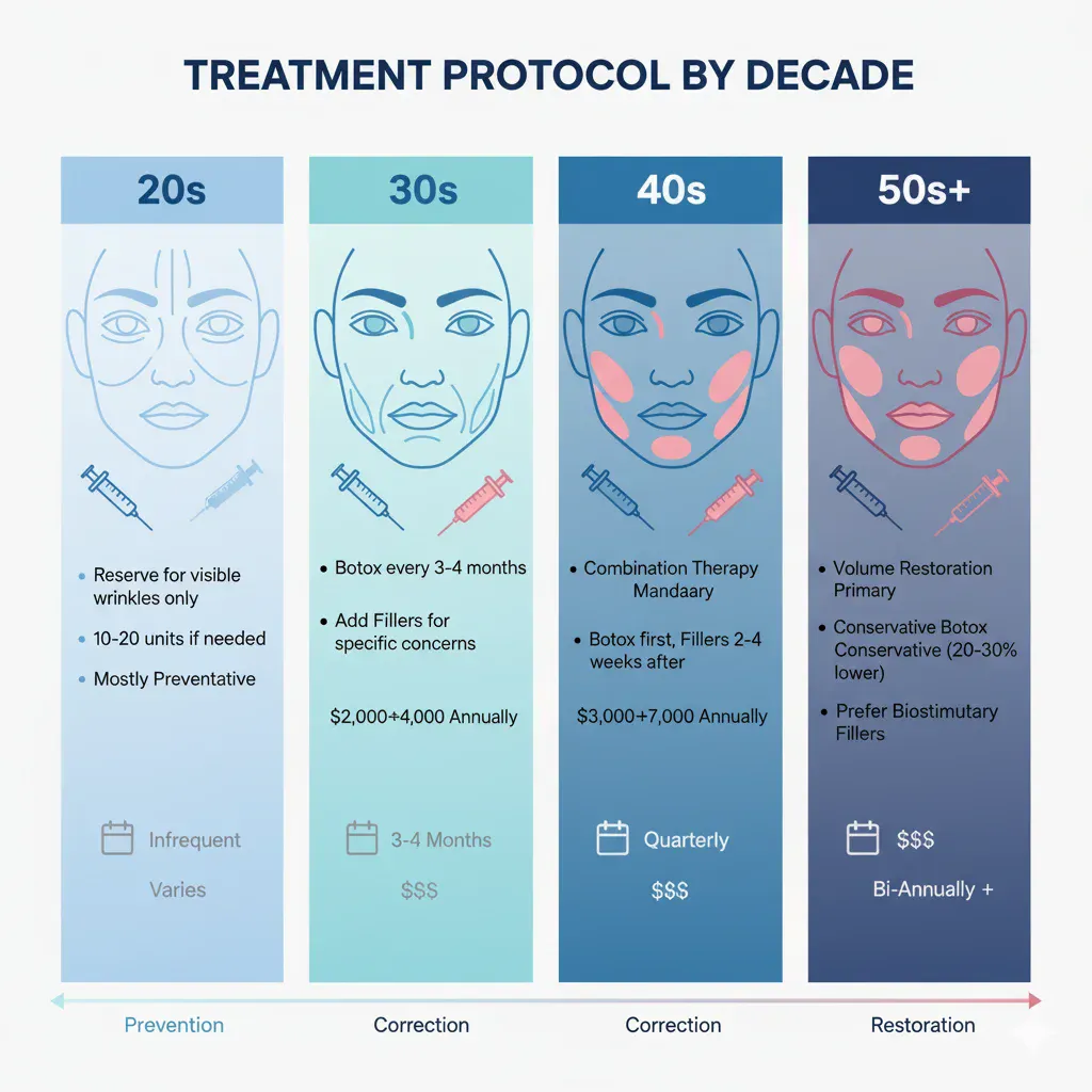 - 40s: Emerging collagen loss creates mixed dynamic and static wrinkles with early volume loss—combination therapy becomes essential