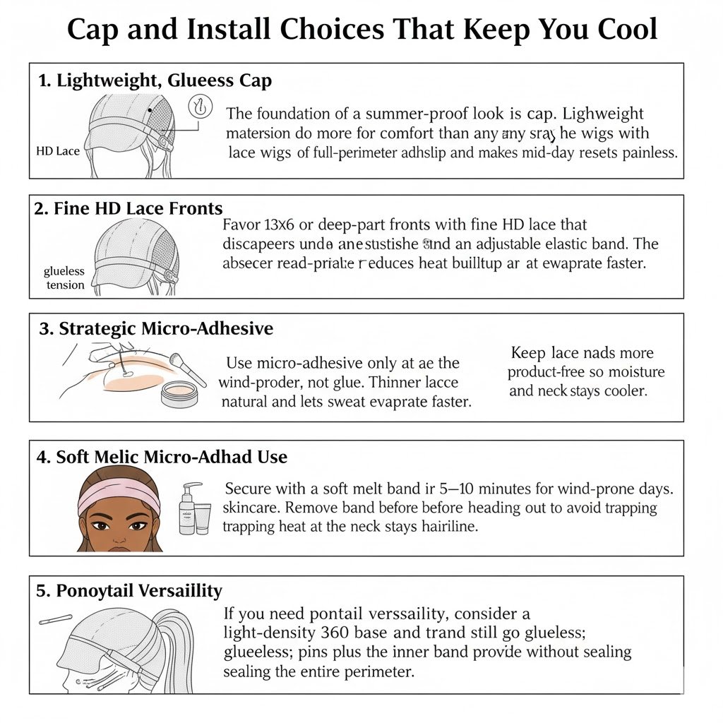 The foundation of a summer-proof look is the cap. Lightweight materials and glueless tension do more for comfort than any spray.