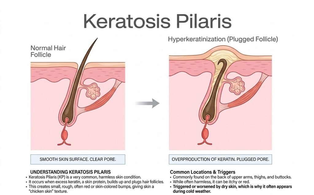Keratosis Pilaris is a condition where hair follicles become clogged with keratin, creating rough patches of skin. These tiny bumps are usually skin-colored but may become red or inflamed over time, especially if scratched or irritated. KP is most commonly found on the upper arms, thighs, buttocks, and sometimes even on the face.
