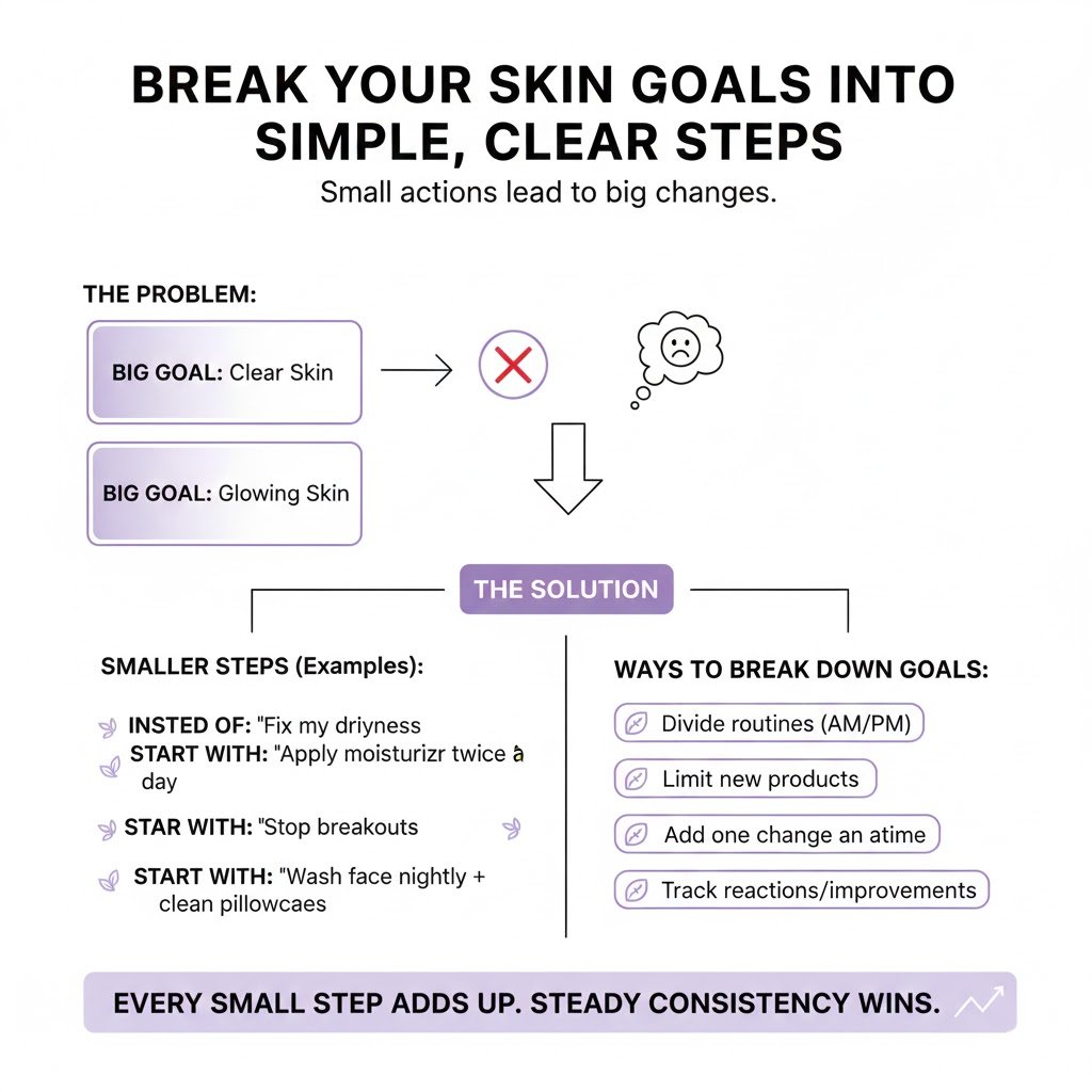 A big skin goal like “I want clear skin” or “I want glowing skin” can feel exciting at first but overwhelming quickly. Breaking your goal into smaller actions helps you stay focused and reduces the pressure.